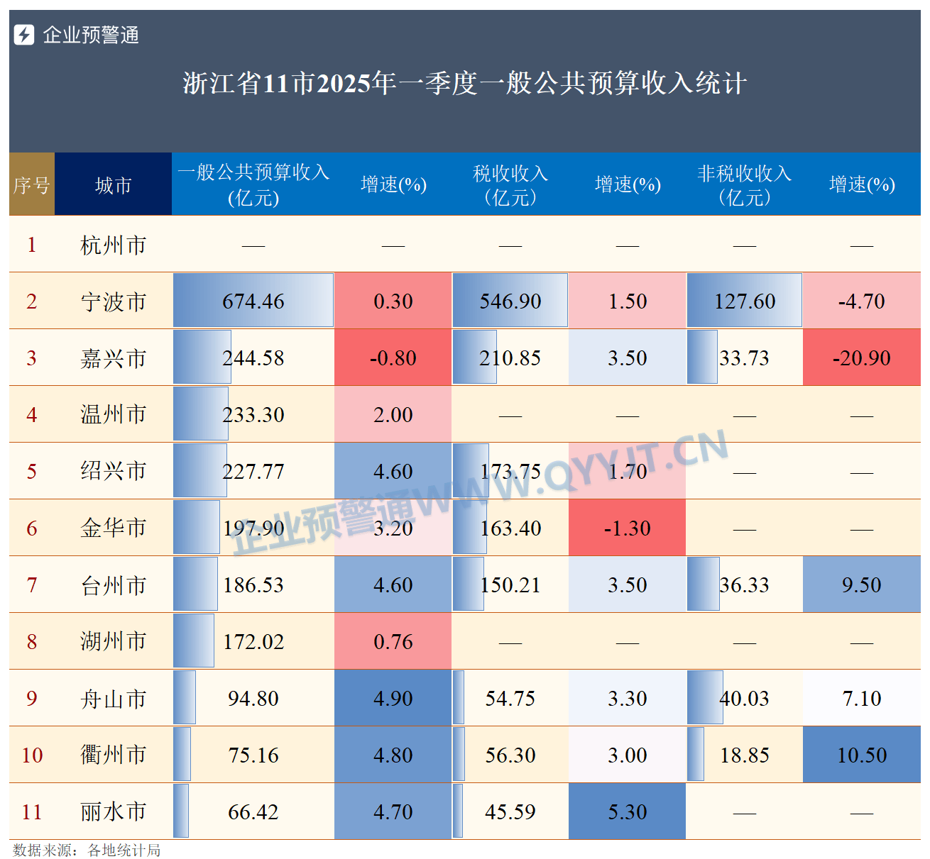 正在财务收入范畴,2025年一季度,浙江省一般公共预算收入3204。40亿元,增加0。2%,此中:税收收入2496。70亿元,下降0。3%,非税收入707。68亿元,增加1。8%,税收收入占一般公共预算收入的比沉为77。9%。目前,除杭州外,浙江省11市均已发布一季度一般公共预算收入环境。虽然杭州尚未发布该数据,但凭仗其雄厚的经济实力,稳居第一的不会改变,全体各市排行也未发生变化。从10市的一般公共预算收入增速来看,仅嘉兴一季度增速为负,同比下降0。8%,其非税收入同比下降20。9%,降幅较大,对财务收入发生了较着影响。其余9市均跑赢全省平均程度,舟山、衢州、丽水、绍兴、台州5市增速达4。6%及以上,增幅显著,此中,丽水一季度税收收入同比增加5。3%;衢州一季度非税收入同比增加10。5%;台州非税收入同比增9。5%。